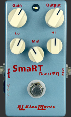 Clean boost, gritty boost, mid boost, bottom boost, treble boost… Don’t pigeonhole your tone by choosing just one! The SmaRT Boost/EQ gives you everything in one box. Over 50 dB of gain on tap and an optimized 3-band EQ circuit makes this an extremely versatile pedal. From totally clean to more than a little dirty, the SmaRT Boost/EQ has your tonal options covered. The Mid EQ alone features up to 25 dB of gain; allowing for tones anywhere from the EC Mid Boost to a half-cocked wah sound!